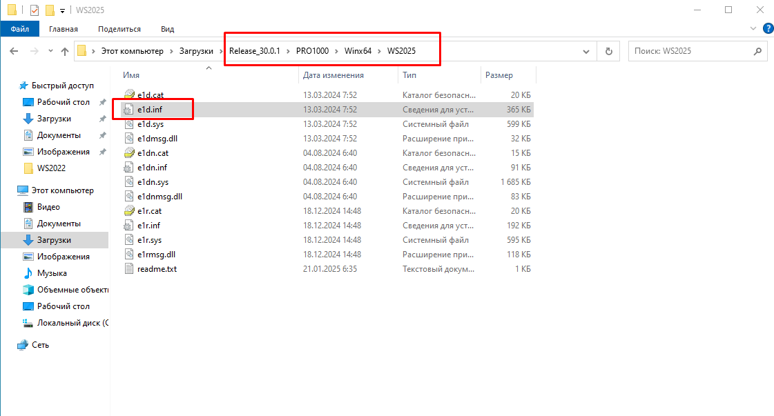 Распаковываем файл Release_30.0.1.zip, находим директорию WS2025 и в ней файл e1d.inf.