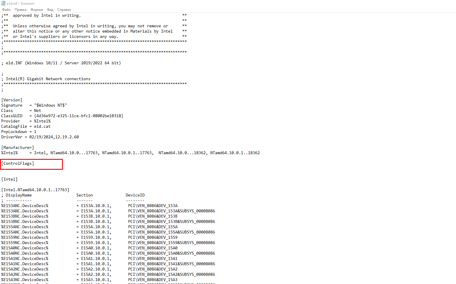 Во второй секции [Intel.NTamd64.10.0.1..18362] искомый ID присутствует, ее пропускаем. В третьей секции [Intel.NTamd64.10.0…17763] и четвертой [Intel.NTamd64.10.0…18362] в конце каждой секции добавляем две скопированные строчки с нашим ID.
